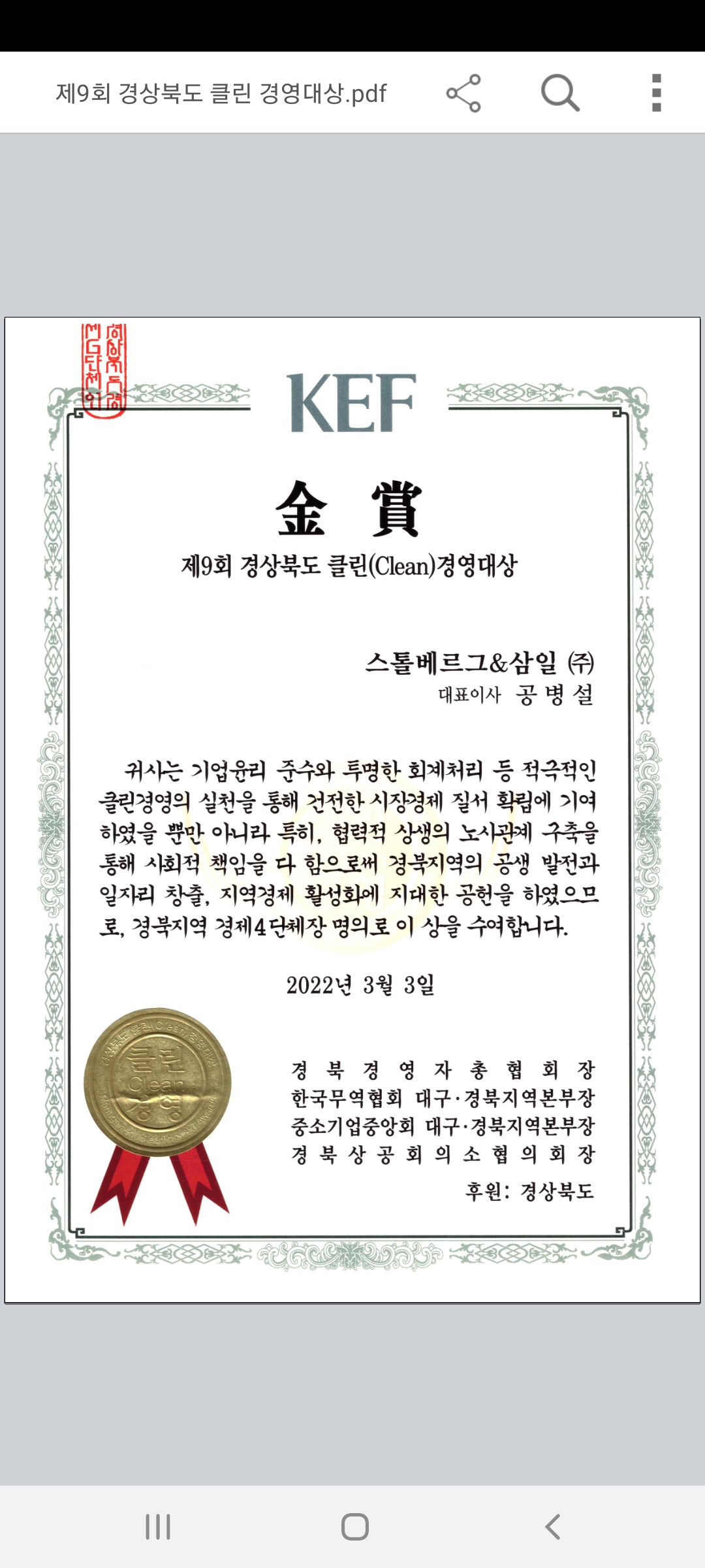 내용 : 경상북도 클린 경영대상- 금상수상